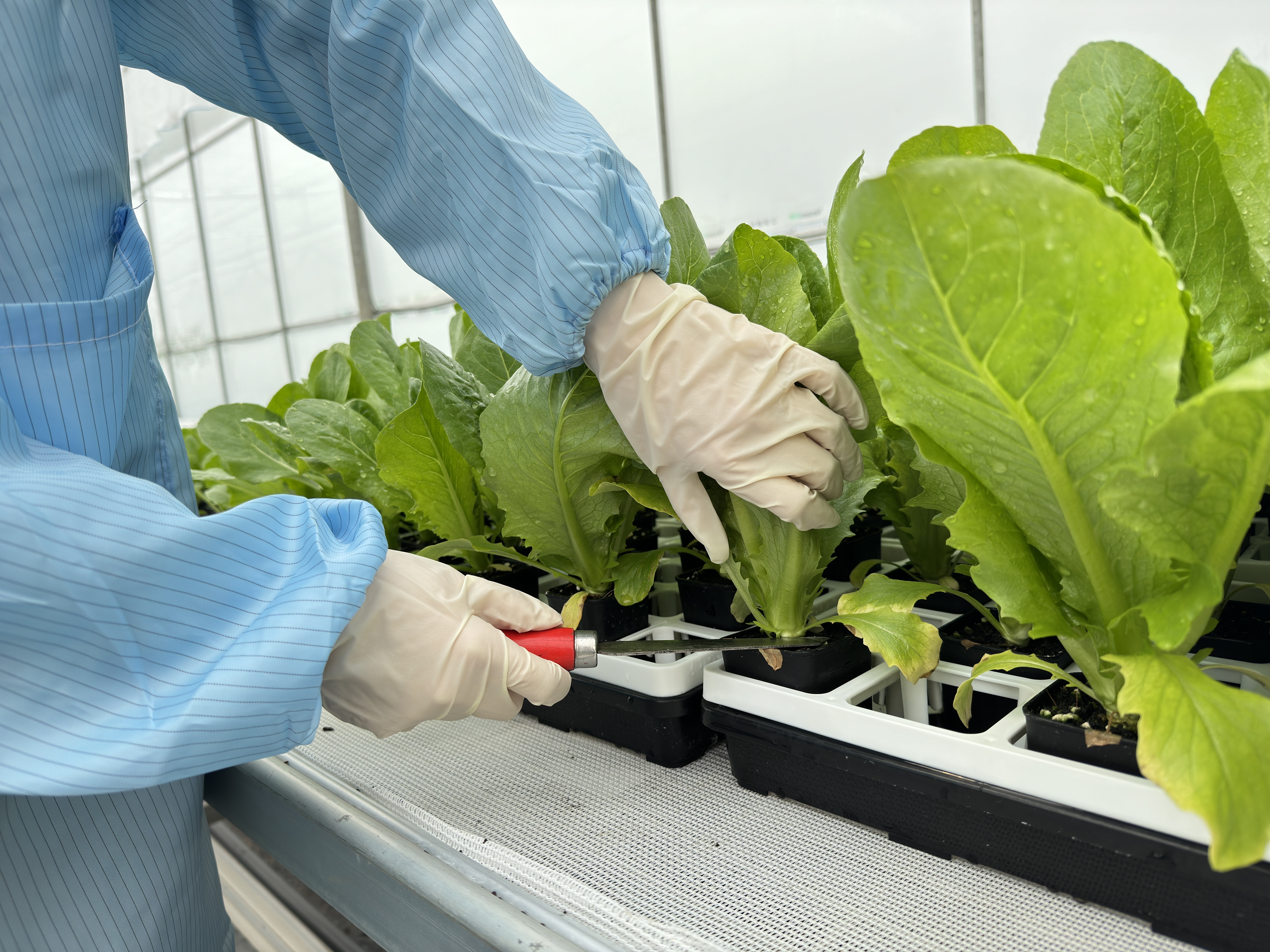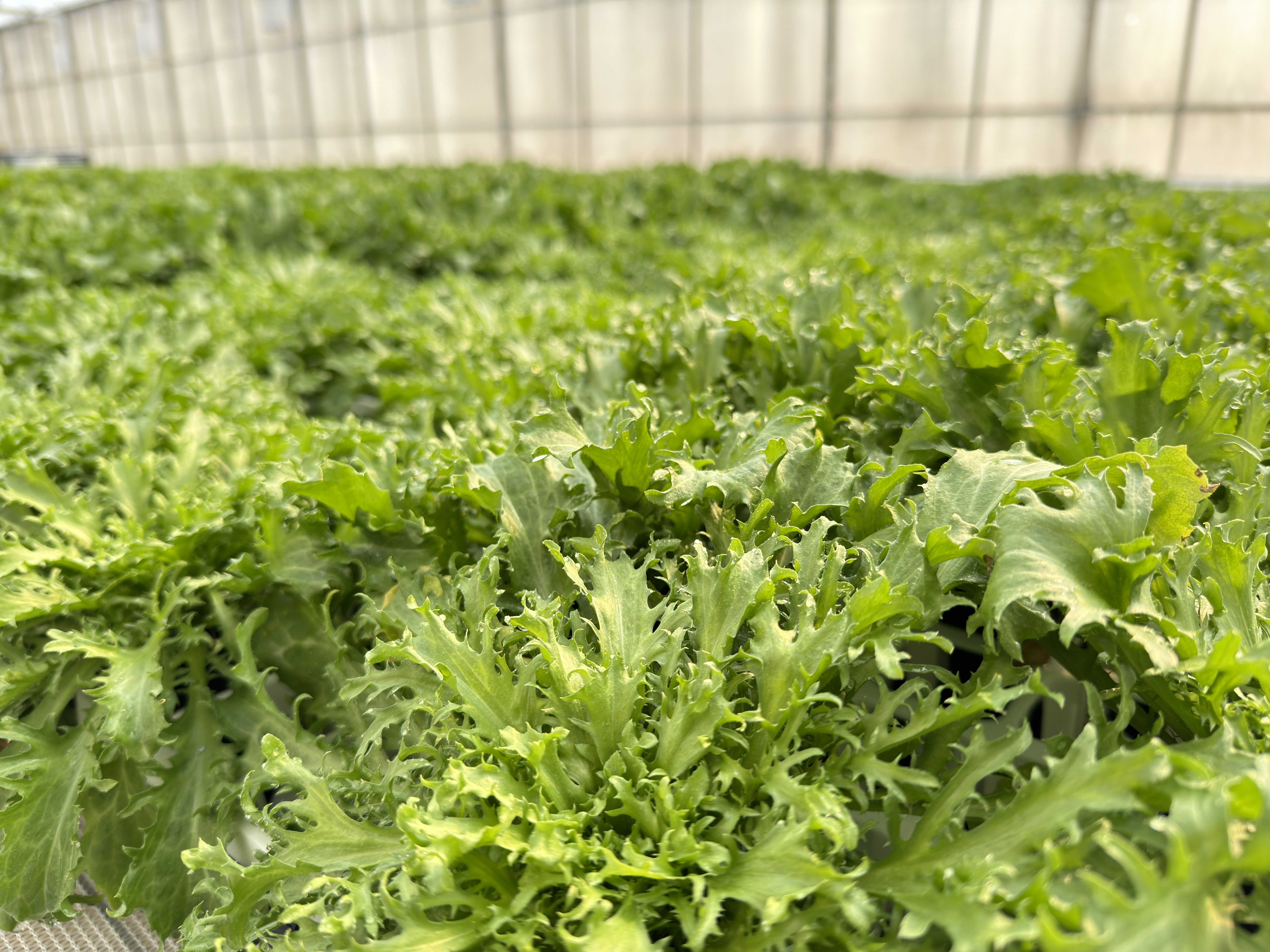 生菜采用无土栽培,在联栋封闭温室中,可智能调节温室内环境。在生产过程中不使用任何农药和激素,坚持自然成熟,适时采摘。每一片菜叶都代表着安全与健康。
