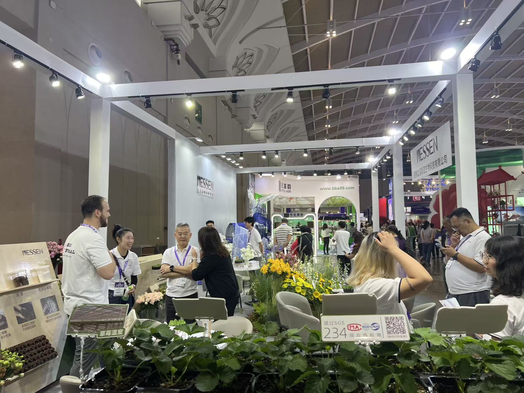 展会期间,立深各展区人流不断。其中不乏专程前来了解立深产品的新客户,也有长期合作的老朋友到场深入交流。蓝紫色调的花艺角成为打卡热点,洋桔梗健壮种苗、草莓高架栽培及环保纸钵产品也引来众多海内外专业客户咨询。现场工作人员全程值守,就产品特性、种植技术与合作模式等与各方访客进行了深入沟通交流。
