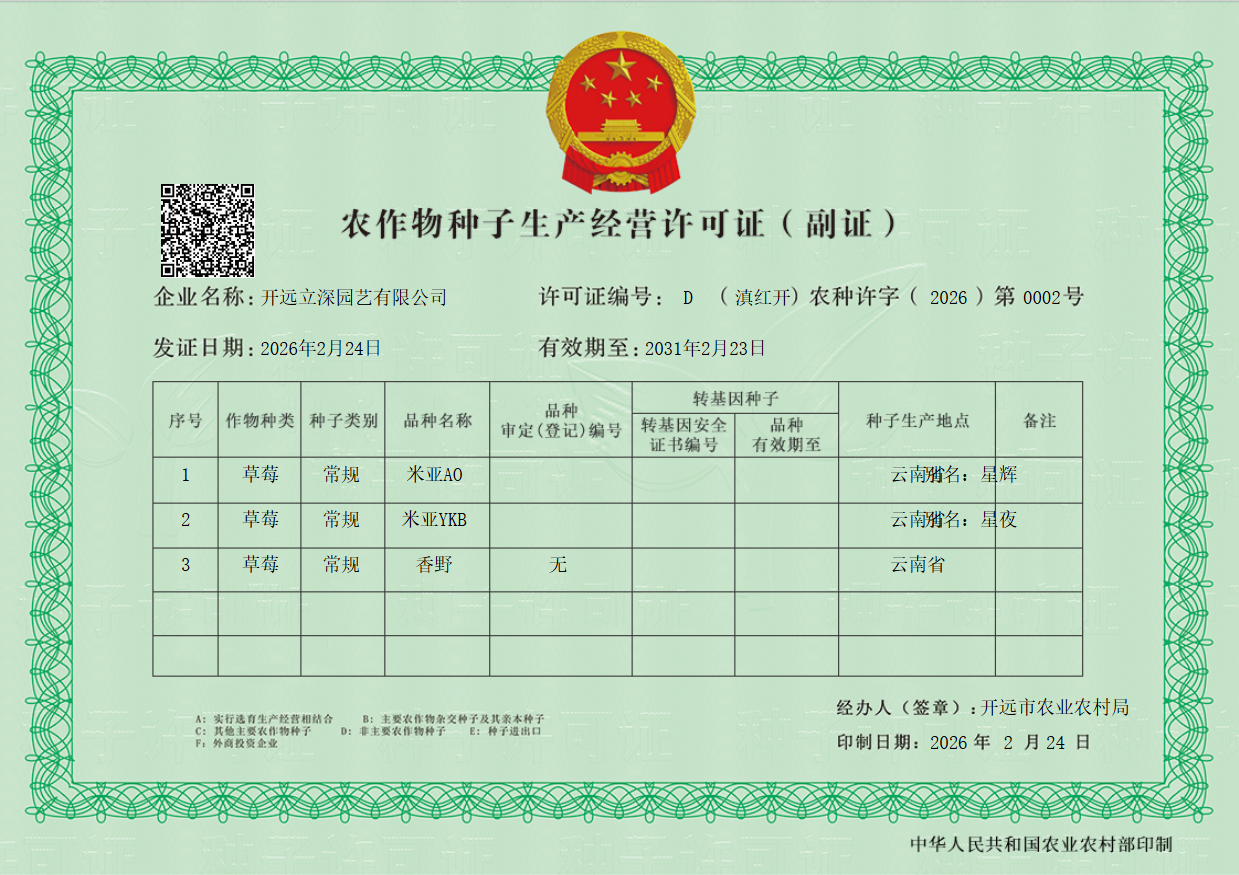 春回大地,喜讯传来。2026年2月,开远立深园艺有限公司历经半年的材料筹备、标准核验与审批,草莓种子生产经营许可证顺利核发完成,为企业后续拓展草莓育苗业务、布局草莓全产业链奠定关键基础。